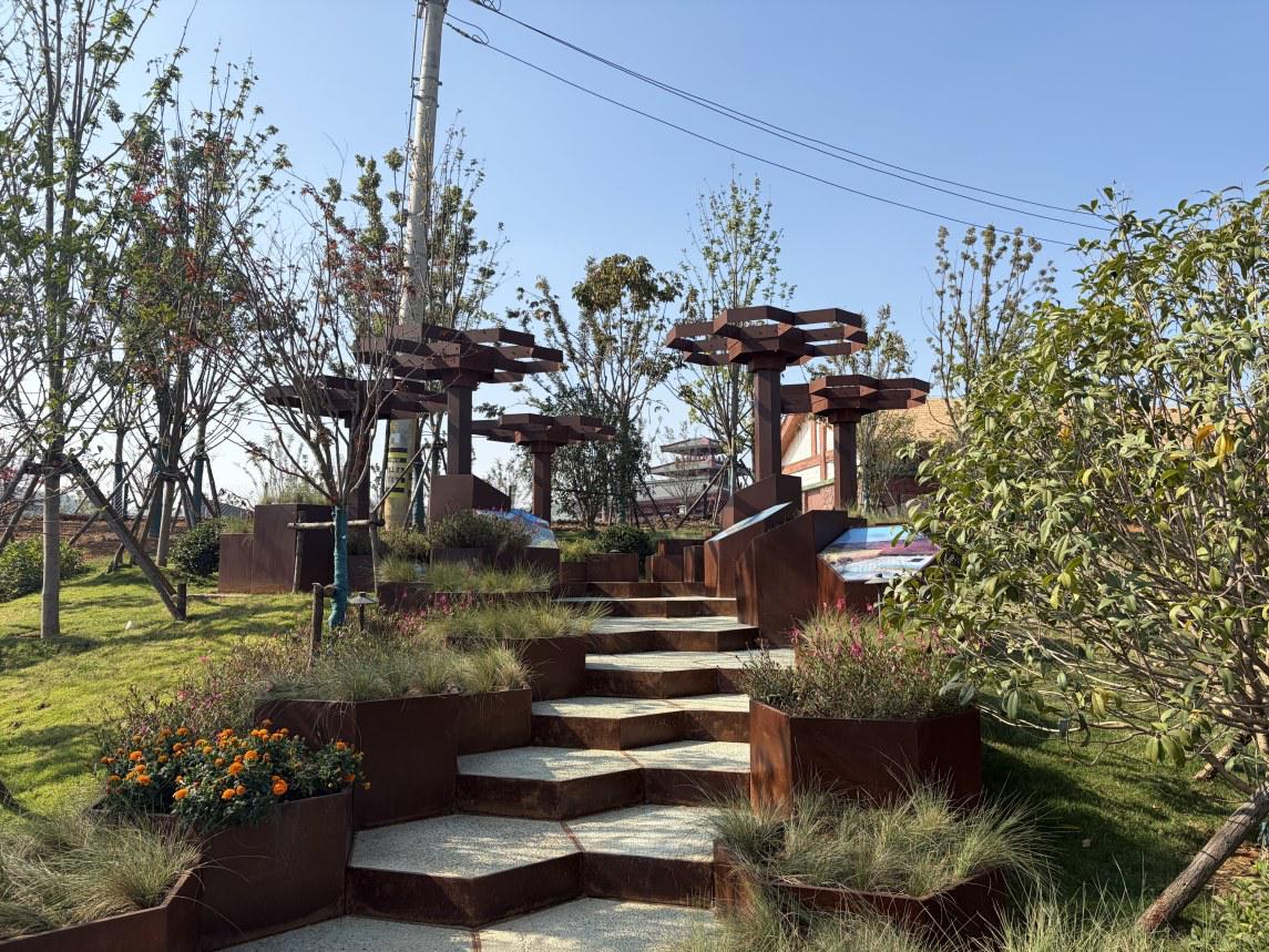 此外,三段主園路分別采用礫石汀步、枕木鐵軌與水泥鋼板鋪裝,巧妙再現(xiàn)了黃石礦石開(kāi)采、運(yùn)輸、加工的產(chǎn)業(yè)鏈歷程。整體工程設(shè)計(jì)合理、施工有序、資料規(guī)范,實(shí)現(xiàn)了材料、工藝與展園主題的高度統(tǒng)一。